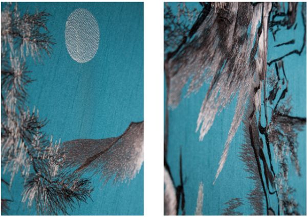 举目望去,全都笼罩在淡淡的烟雾之中,不时有几声布谷鸟的呼唤从远远近近的树上、空中传来。绣工细腻,自然灵动,光影承转之时,明暗交辉之间,风味此起彼伏,将简明而古朴的意蕴淋漓展现。