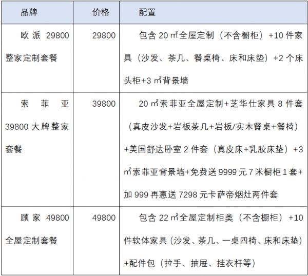 以市面上最主流的欧派、索菲亚、顾家3大品牌的整家定制套餐为例:(说明:欧派和顾家都是单个套餐,而索菲亚39800针对不同用户需求设置了4款配置,以最核心的索菲亚大牌整家套餐来举例对比):