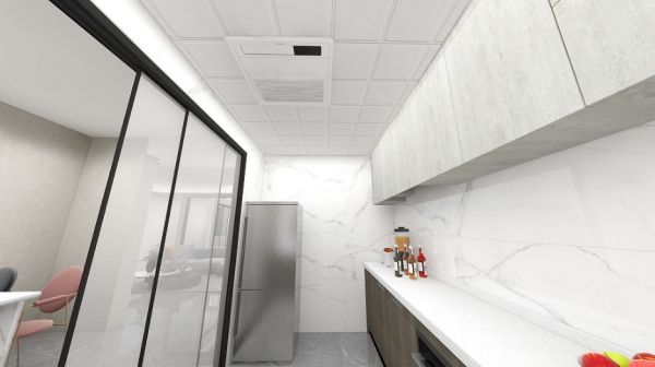 由于陈先生家里的厨房和餐厅离得很近,厨房门采用推拉门设计,在餐厅吃饭时打开移门,可以兼顾餐厅和厨房两个空间,而且对比凉霸,厨房专用中央空调还有制热效果,一年四季都可使用。