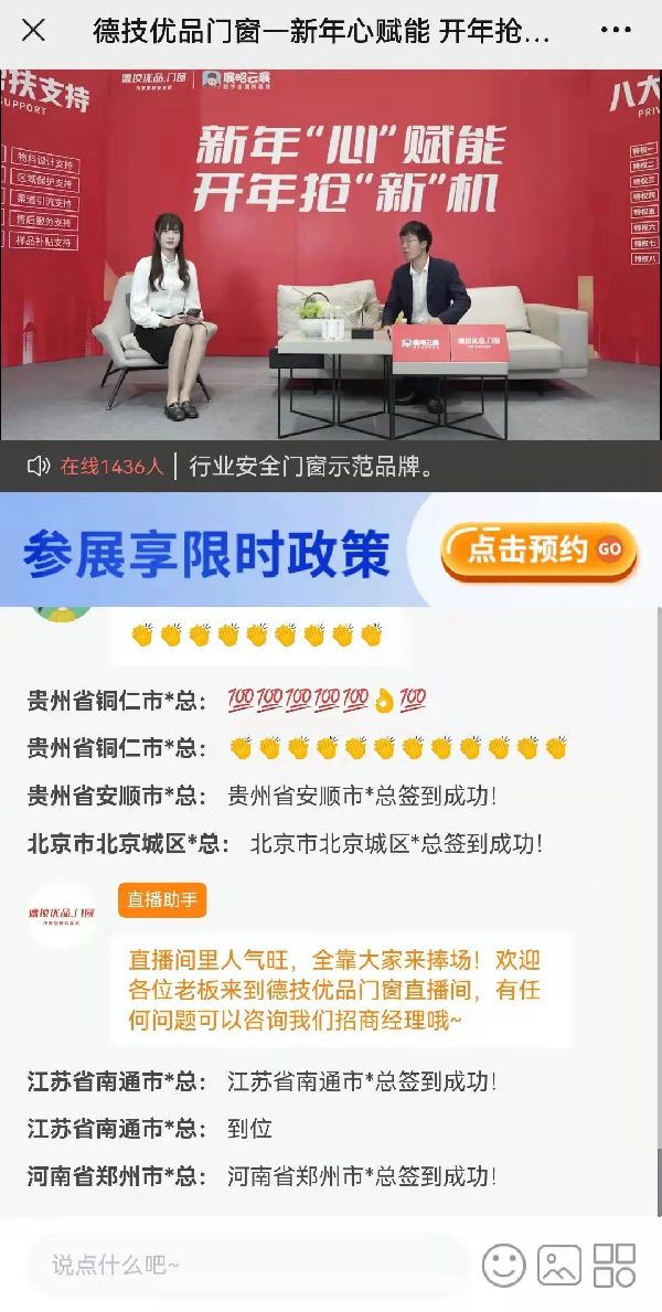 这是德技优品2022年的第一场线上招商直播,品牌推荐官晴天到场倾力支持,现场也邀请了招商部总监李轩介绍企业的生产优势、品牌优势、加盟特权政策;邀请营销支持部麦老师解读德技优品门窗N6新商速盈系统和R8大商缔造系统的帮扶动作。专业的分享,让直播间的意向加盟者快速了解品牌,做出正确决策。