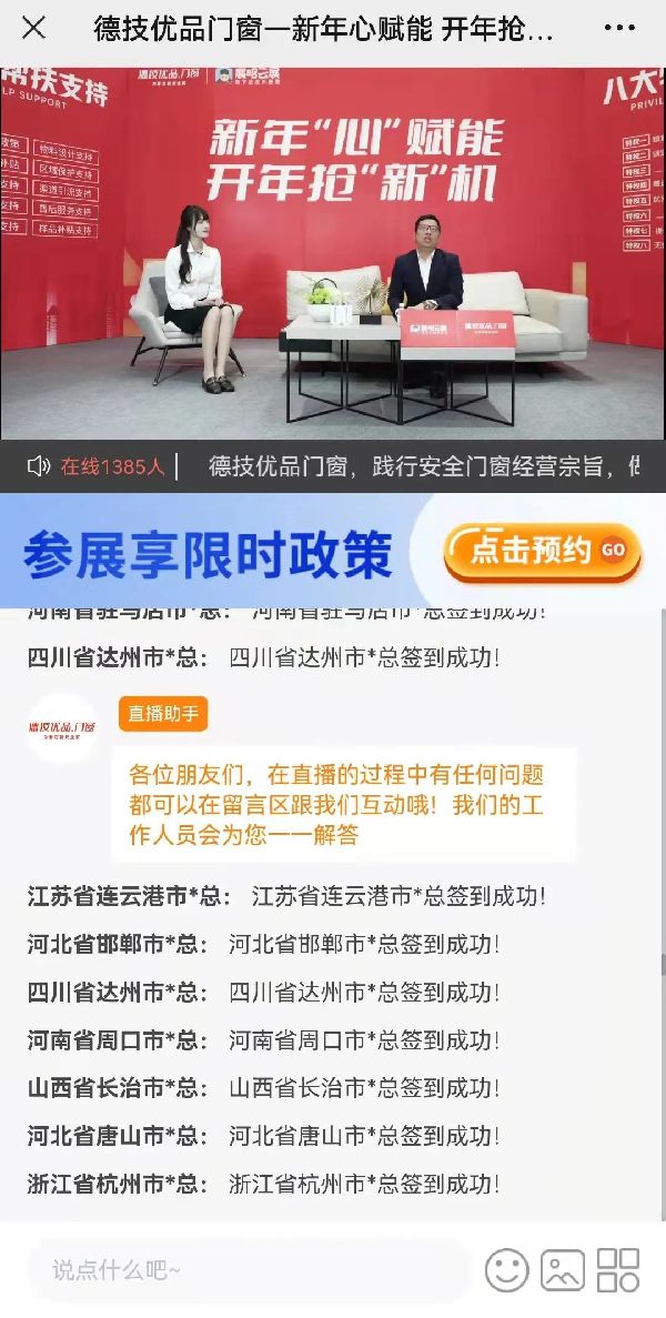 直播中,活动亮点一波紧接着一波,开场即发红包,快速点燃直播间气氛;此外,直播间还首次介绍门窗新品,让意向加盟的朋友大饱眼福;工厂介绍细致到位,大商榜样视频激发加盟的信心,互动评论区留言一条又一条,火热非常……