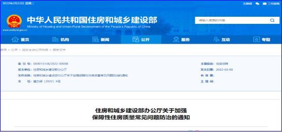 为进一步提升工程质量,保障人民群众切身利益。近日住建部办公厅发布了关于加强保障性住房质量常见问题防治的通知,通知从提高对保障性住房工程质量重要性的认识、制定便于监督检查工程质量的技术要点和强化责任落实和监督管理三个方面进行了详细部署。