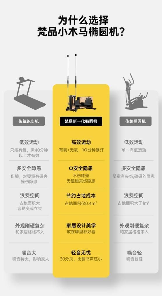 梵品团队选了与跑步机同属“跑步”大类目的椭圆机这个品类,通俗的说椭圆机就是在太空中跑步。在具体产品设计上,梵品的小木马椭圆机创新采用弹力棒扶手,功能实现有氧+无氧,占地小,在长度、宽度、高度、面积、体积,五个尺寸标尺均小于同行。设计上去掉复杂铁架扶手,改用具有专利的弹力帮扶手,全机身圆角设计,避免安全隐患。使用音量为30分贝,不打扰家人和邻居。美学标准采用家居美学设计,而抛弃过往的机械美学标准。