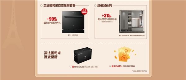凡是在2月21日-3月20日活动期间,下定法国司米百变星厨套餐的用户,还能享受315三重好礼,惊喜第一重,只需再加999元,就能享受价值5999元的老板电器洗碗机一套;优惠第二重,只需再加315元,就能为家中增添一个高颜值的1㎡法国司米定制鞋柜;诚意第三重,无需任何费用,即送臻尚大礼包(内含刀具、砧板、炒锅)一份,还可享受3150元大牌电器抵用券的福利。