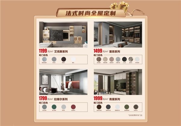 无论是想要一款为家量身定制的理想橱柜,还是一个私人定制的家,法国司米都能满足你的心愿,在此活动期间1199元/㎡艾克斯系列、1499元/㎡里昂系列、1799元/㎡拉维尔系列、1999元/㎡青黛系列组成的四大畅销全屋系列,总有一款能满足你的喜好与预算。
