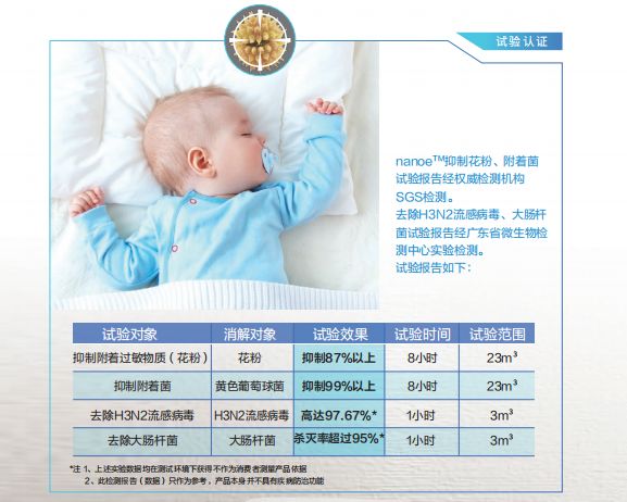 据权威检测机构SGS检测,nanoeTM技术对H3N2流感病毒去除率达到99.02%,对黄色葡萄球菌的去除率达到99%以上,大肠杆菌去除率也高达95.6%,而对附着霉菌的抑制效果也达到了防霉等级1级标准。