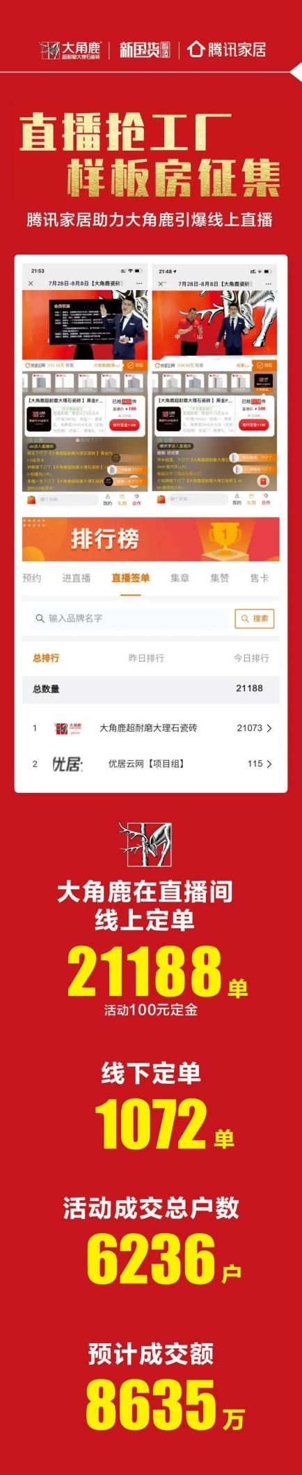 经过直播间的预热,在腾讯家居的支持和大角鹿主动营销团队帮扶下,为期12天的“直播抢工厂样板房征集”活动吸引了全国大角鹿门店参与,线上下定21188单,成交客户达6236户,预计成交额8635万。
