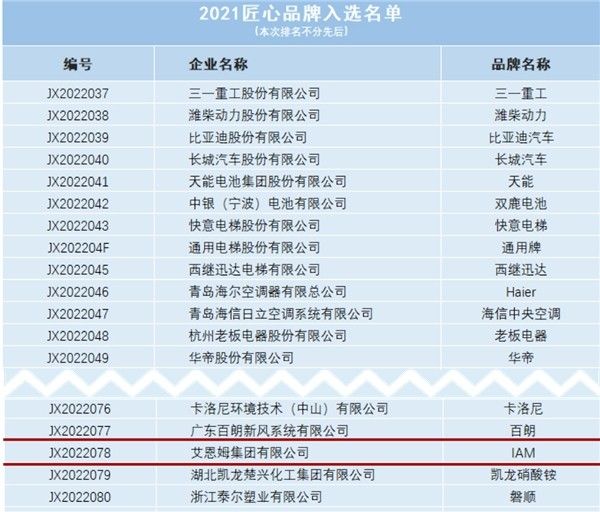 据悉,本次评价于2021年11月30日启动,历时三个月,共评价品牌296个,涵盖了家用电器、电子通讯、空净等多个行业领域。IAM凭借深耕健康电器领域多年的自主创新和技术、享誉全球的市场口碑,得到主办方的高度肯定。最终,IAM与比亚迪、海尔、海信、老板电器等多家知名企业共同入选匠心品牌榜,并被收录至匠心品牌查询系统。