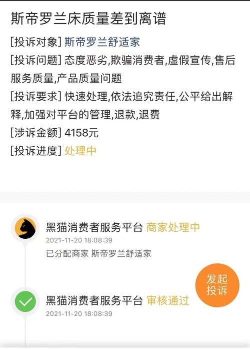 网友“7479136056”2021年11月3日在淘宝斯帝罗兰官方店网购买皮床,结果床板破损、起刺,床身外包皮走线不均,做工差,质量存在问题。网友“7479136056”联系客服要求处理。店铺客服回复爱要不要,不要就退款,要就送个抱枕。后网友“7479136056”在黑猫投诉平台反馈此事,并要求商家快速处理与退款。目前,黑猫消费者服务平台已经把此事反馈至商家,并显示正在处理中。