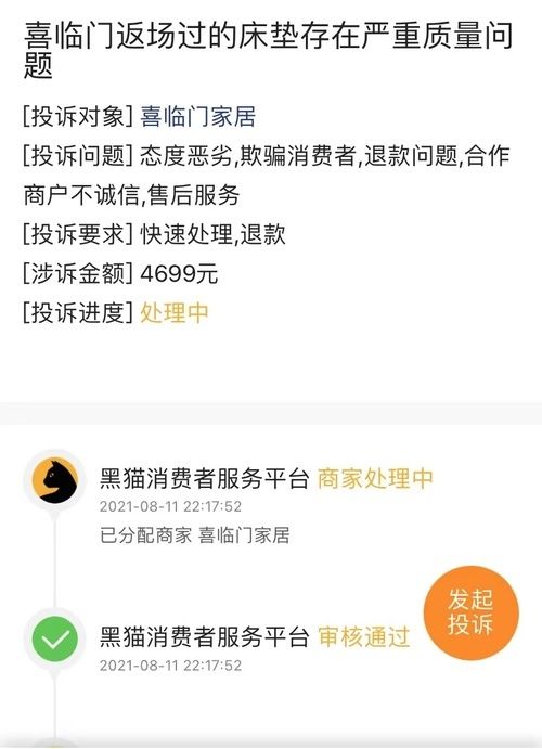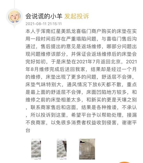 2021年8月11日,网友“会说谎的小羊”在黑猫平台投诉喜临门家居返场过的床垫存在严重质量问题。此前,“会说谎的小羊”在浑南一家卖场喜临门专卖店购买床垫,使用后存在塌陷问题,与喜临门售后沟通,并返场维修。但维修后的床垫出现了舒适层不会弹,床面凹陷地方较多、床垫气味特别大等问题。“会说谎的小羊”联系商家售后和店面处理,但商家推诿。 “会说谎的小羊”在黑猫投诉平台反馈此事,并要求商家快速处理与退款。目前,黑猫消费者服务平台已把此事反馈至商家,并显示正在处理中。