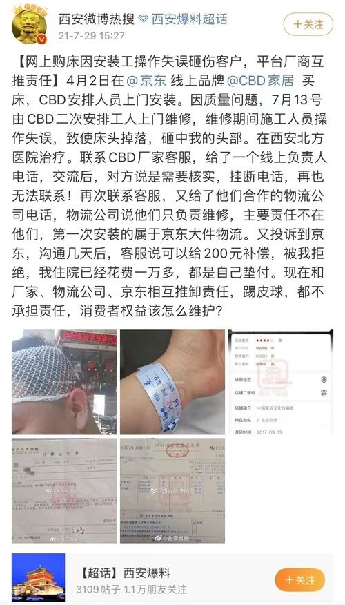 2021年4月2日,西安吴先生在京东CBD家居店购买一张床。7月13日,因质量问题由CBD二次安排工人上门维修,维修期间施工人员操作失误,致使床头掉落,砸中吴先生头部,并在西安北方医院治疗。后联系CBD厂家客服,并给了线上负责人电话,交流后,商家称需要核实,后联系不上。再次联系客服,又给了他们合作的物流公司电话,物流公司称他们只负责维修,主要责任不在他们,第一次安装的属于京东大件物流。又投诉到京东,沟通几天后,客服说可以给200元补偿。但吴先生住院花费一万多。