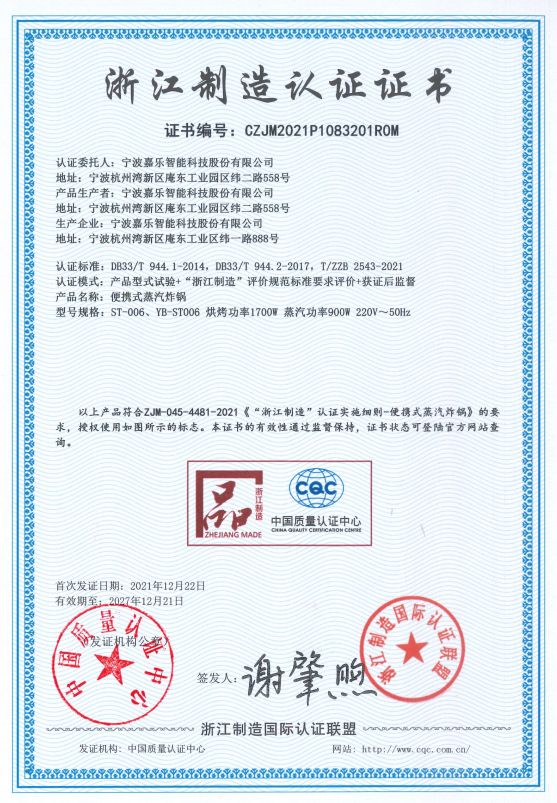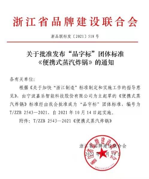 早在去年10月份,由悠伴电器母公司——宁波嘉乐智能科技股份有限公司主导起草的《便携式蒸汽炸锅》标准经由浙江省品牌建设联合会批准成为“品字标”团体标准T/ZZB 2543—2021正式实施。