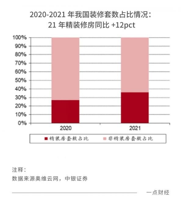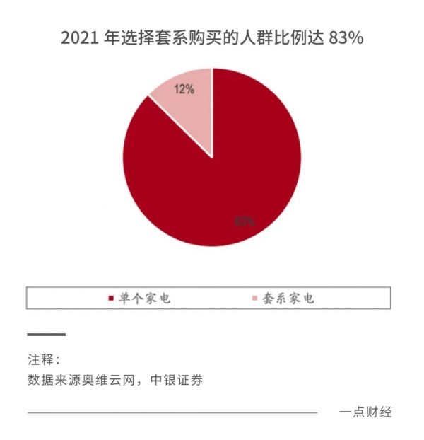 同样来自奥维云网的《中国家庭成套家电用户洞察白皮书》显示,近两年有过新装修或者购买过家电的人群中,选择套系家电的人群比例达12%,2021 年选择套系化购买的人群比例达83%。