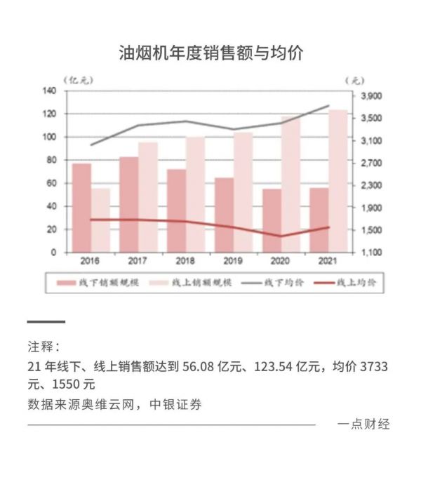 在中国家电行业整体走向高端化的背景下,老板电器也在走向高端化。根据奥维云网数据,2021年全年老板吸油烟机线上、线下均价分别同比增加12.90%、 6.51%,单价6000元以上的双腔智能吸油烟机获得市场认可,结构性地提升了烟机均价。