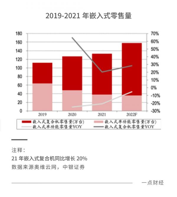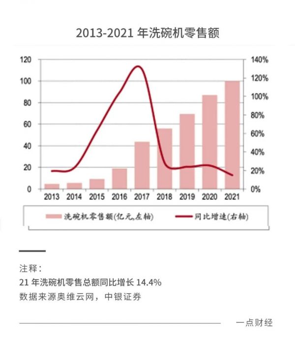 比如洗碗机,奥维云网(AVC)推总数据显示,2021年全年洗碗机市场零售额为99.6亿元,即将迈入百亿,同比增长14.4%,零售量195.2万台,同比增长1.7%。其中,嵌入式零售额79亿元,同比增长10%,零售量133万台,同比增长5%。
