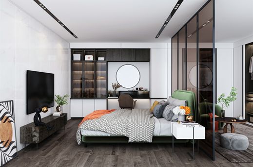 城市生活的人们普遍对床充满依恋,因为一天的行动从床开始,一天的安静也从床开始结束。卧室是一个家中重要的私密空间,柏厨家居曼居,从空间的合理构建开始,打造舒适的卧室空间。一个玻璃隔断让卧室和衣帽间比邻相依,侧方的定制柜,采用同样的玻璃作为主区域的柜门,在风格上相互呼应,为了满足梳妆的需求,大面积方形的墙面留白搭配了圆形化妆镜,简约的几何构图为整个卧室空间增添了几分大气简约质感。将红酒和书籍都收纳在若隐若现的柜子里,随时可取,每一个温馨的夜晚,热水澡后都能瘫在柔软的大床之上,翻上几篇散文或者小说,偶尔还可以小酌一杯,还有不能缺少的电视背景乐。时间一到,迅速放下手里的一切和自己说声晚安,而玻璃隔断的另一侧,就是你迎接明日挑战的战衣!在有限的空间,做出更多的收纳,在小小的空间达成更多的舒适享受,生活的浪漫感也许就来自这些无法拒绝的细节。