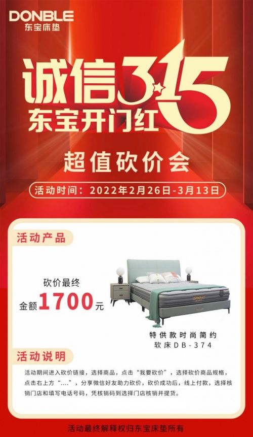为回馈广大新老客户一直以来的支持,2月26日-3月13日,东宝床垫限时推出t供款软床,1.5米*2.0米的精美软床,通过官方公众号参与活动1700元就能带走。