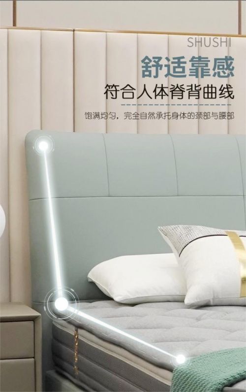 床头软包采用超力棉填充,看上去十分圆润饱满。微弧形靠背设计,能够贴合人体腰部曲线,让倚靠更加舒适自然。