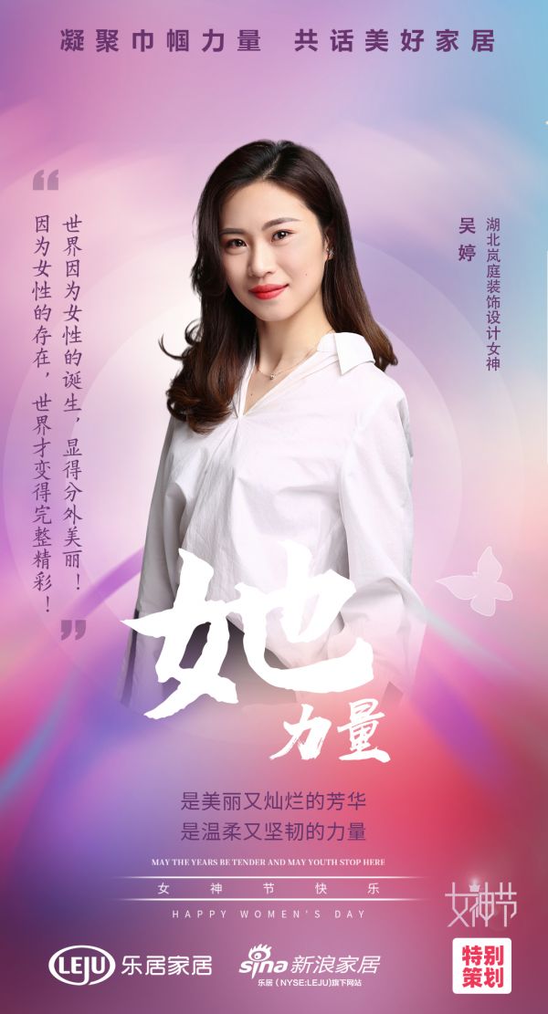 在3月8日这个专属于女性的节日里, 武汉新浪家居特别策划家居女神节,走近「家居她力量」,让我们更进一步的认识,这个在家里温柔而美丽的女子,在工作上大方而坚韧的力量。