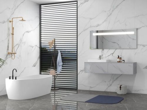 墙砖铺贴博德生态岩板雪域晴川,色调几近纯白,如水墨画的纹理肆意伸展,一幅雪域青黛的美景便勾勒而出。营造卫浴空间清爽感的同时,更添加了艺术人文气息。