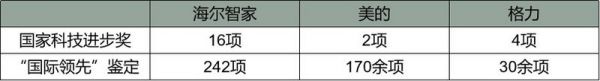 此外,在国家科技进步奖上,海尔智家累计获得16项国家科技进步奖,美的2项,格力4项;在“国际领先”鉴定方面,海尔智家242项,美的170余项,格力30余项。