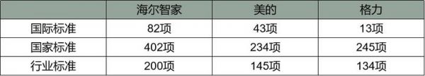 家电巨头们在科技研发上的投入,正在不断转化为优异的科技创新力,从而进一步掌握了行业话语权,推动行业标准化高质量发展。在标准制订方面,海尔智家累计主导或参与82项国际标准、402项国家标准以及200项行业标准;美的累计主导或参与43项国际标准、234项国家标准以及145项行业标准;格力累计主导和参与13项国际标准、245项国家标准和134项行业标准的制修订工作。在5大国际标准组织中,海尔智家实现了全覆盖,美的、格力都进入了ISO、IEC。