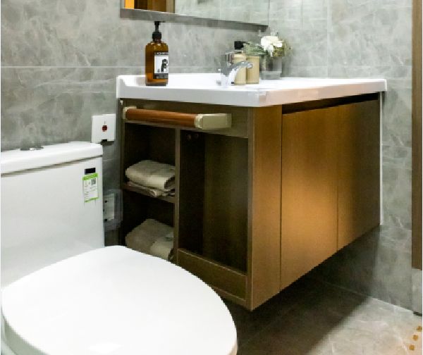 浴室柜的收纳布局更是体贴入微,将置物柜的一侧改为开放层架,让空间利用更合理化,随手就能拿到备用的纸巾、毛巾等用品,避免了需要起身拿纸的尴尬。