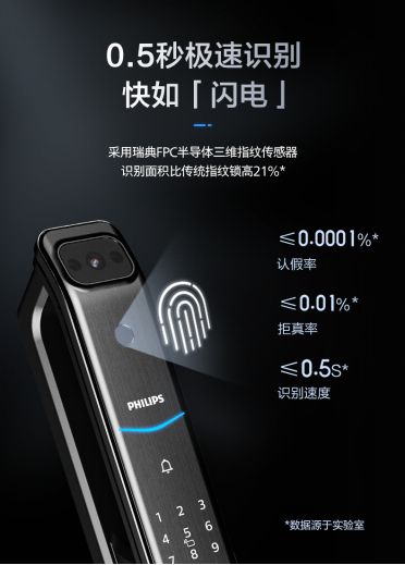 智能门锁的指纹技术技术目前已经过两代,第一代指纹识别技术是光学指识别,第二代是半导体活体指纹识别。前者容易被复制指纹解锁,安全性较低。后者冒用的假指纹开不了锁,识别准确率高。飞利浦智能锁DDL708-V装载瑞典FPC半导体三维指纹传感器,采用银行级指纹解决方案,识别面积比传统指纹锁高21%,可达到低于0.5秒极速识别,小于0.0001%认假率,无论从使用体验上,还是从安全性能上,都堪称极致。