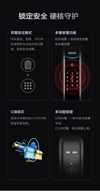 据公安部统计数据显示,我国每年因入室盗窃造成的家庭损失高达11300亿元,3.5亿户居民家庭财产安全无法得到充分保障,安全性成为个人、家庭、社会最迫切需要解决的问题。而市面上常见的锁芯分为三种,A级、B级、C级锁芯,其中,C级锁芯更安全。理论上,即使是专业开锁人员,至少也需要270分钟才能打开。飞利浦智能锁DDL708-V则采用了C级锁芯,区域互开率几乎为零(一千亿分之一)。叶片结构为48颗叶片加双边柱锁定;如果用强扭工具开启锁芯,锁芯内部破坏,自爆锁死,导致无法开启。可谓武装到了牙齿,防盗性能加倍。