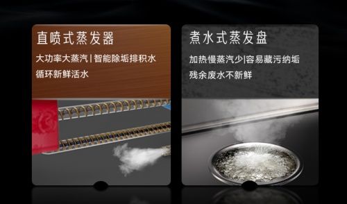 以最基本的蒸汽发生原理为例,目前市场上的蒸烤集成灶往往仍延续着传统的外盘煮水的形式,即通过内腔底部设有的蒸发盘将水加热煮沸来产生蒸汽。而采用了这种设计的产品普遍存在上气慢、蒸汽软绵、不易穿透食材、脱脂能力差、易积水造成清洁困难、易滋生细菌不健康等缺点,蒸出的食物容易发软发黄,无论外观还是口感都大打折扣,烹饪效率也很低。