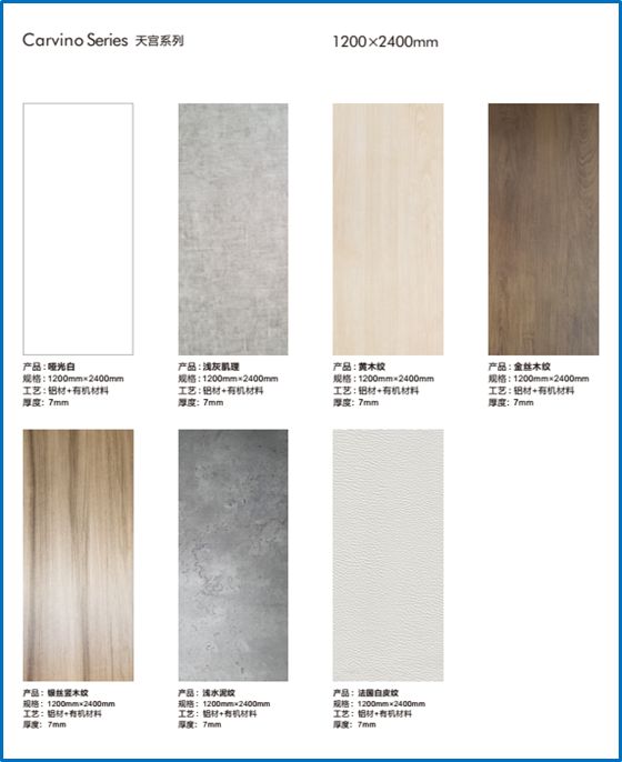 天宫系列蜂窝大板2.0颜色多样,拥有月光白、肤感灰、雪岩、灰亚麻布纹、浅灰肌理、银丝木、金丝木、黄木纹、法国白皮纹、巴西棕皮纹等颜色,多种风格,匹配多样化的家居需求,健康环保,为美好生活筑家。