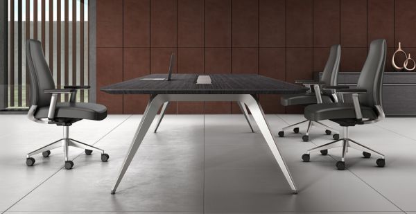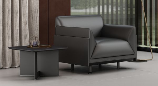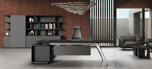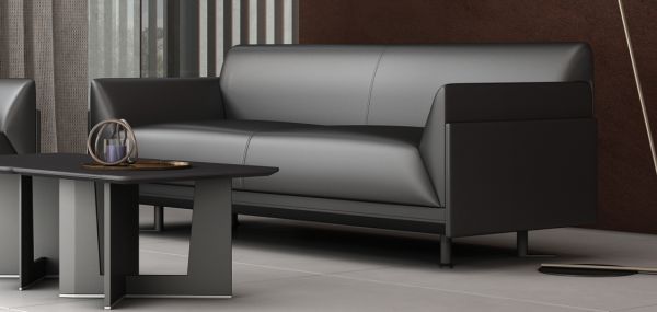 高管桌和会议桌都采用干净利落的弧形钢脚设计,搭配高亮的抛光工艺,可呈现出金属材质独有的质感和张力。在细节方面,高管桌的侧柜采用开放收纳格设计,具有临时收纳功能,使用时触手可得;会议桌的台面配置自主设计双翻机构线盒,可满足会议需求的走线功能,轻奢又时尚;沙发搭配茶几,可通过自由组合,满足不同尺寸空间的使用需求。