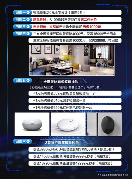 回馈五:全屋智能套餐1元超级换购智能语音控制音箱、智能漏水检测、智能红外家电控制器。(三室舒适版套餐3选1;三室精英版套餐3选2)