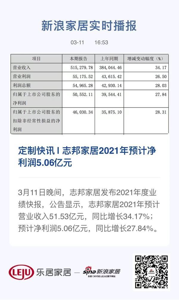 新浪定制频道讯 3月11日晚间,志邦家居发布2021年度业绩快报,公告显示,志邦家居2021年预计营业收入51.53亿元,同比增长34.17%;预计净利润5.06亿元,同比增长27.84%。