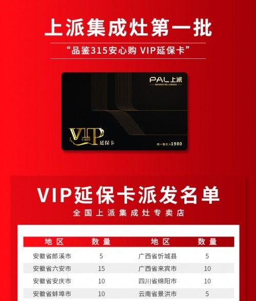 品鉴315,惠享1+7, 活动期间购买上派款集成灶由公司总部赠送价值1980元上派VIP延保卡。(质保由1年升级到延保8年,每店限量10名 )
