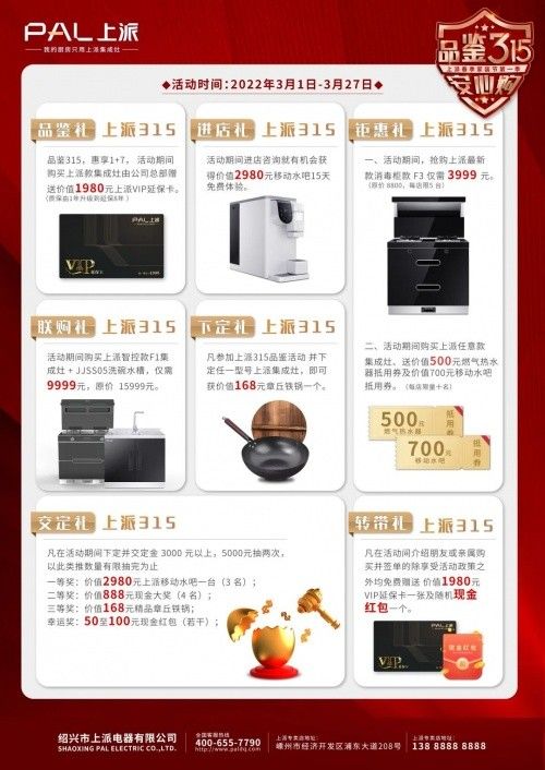 315将至,一向以消费者为上宾的上派集成灶怎会错过这个让消费者受惠的机会?315上派安心购活动火热进行中,七大豪礼等你进店取!还不知道315上派安心购的具体活动内容吗?且看小编为你细细道来!