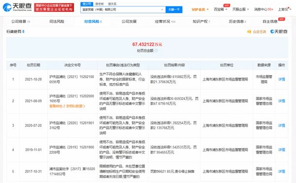 8月9日,国家企业信用信息公示系统显示,宜家贸易(中国)有限公司因存在以下违法行为:使用不当容易造成产品本身损坏或者可能危及人身、财产安全的产品无警示标志或者中文警示说明,8月9日被上海市浦东新区市场监督管理局处以没收违法所得30.66万元,罚款47.68万元,罚没合计78.34万元。