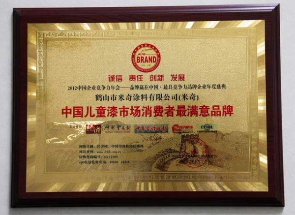 凭借对儿童漆的专业研发,米奇漆深受市场和行业认可,在全国开展的“品牌赢在中国·最具竞争力企业”主题公益调查活动中,米奇漆荣获中国儿童漆市场消费者最满意品牌,再一次证明了品牌实力。