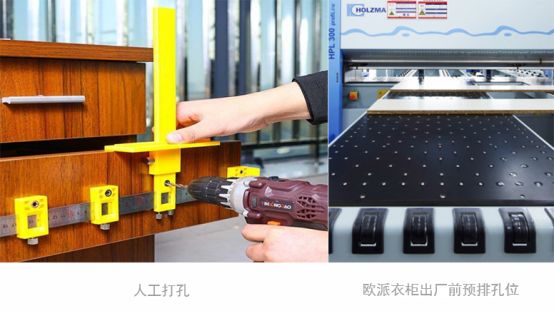 除了五金之外,五金安装技术也是困扰很多家居企业的难题,传统的打孔安装不仅容易出现定位偏差,而且影响美观,安装的时候还会产生很大的噪音和粉尘,影响邻里和谐。欧派衣柜基于这些不足,对工艺进行了升级,采用AI智造免打孔安装技术更加精准地对五金安装孔进行定位,欧派的AI工厂可以实现出厂前预排孔位进行生产设计,在工厂内就可以完成五金功能配件和门柜板件进行打孔连接的部位定位打孔,这样后期安装的时候就可以有效确保无尘无噪音,优化安装体验。