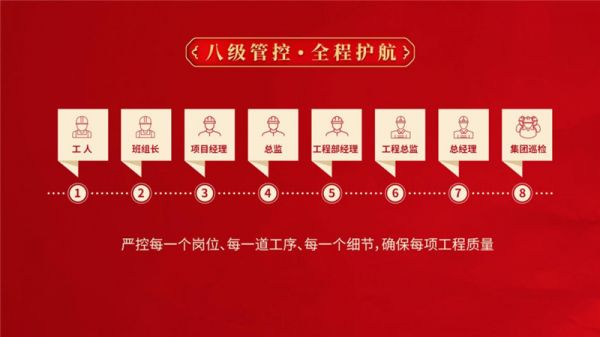 金煌装饰独创的8级质量管控体系,3大卓越交付标准,32道金匠工艺,涵盖施工、工艺、材料、监理、健康、售后的方方面面。