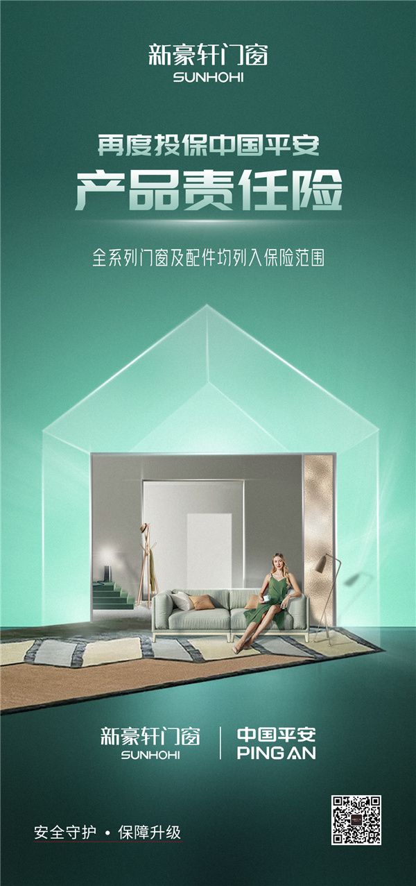新豪轩深知门窗对于家的重要性,不仅执着于品质的极致追求,今年亦与中国平安保险再度达成合作,投保全系列门窗及配件,以产品责任险,保证用户与家庭的人身、财产安全。