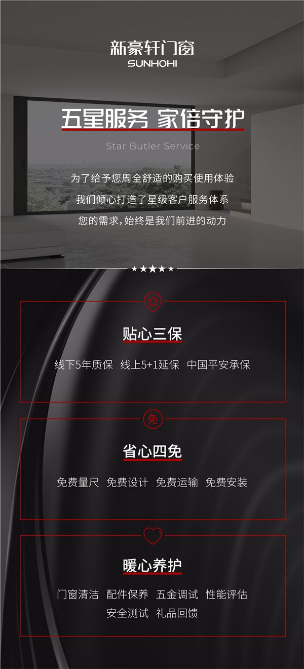 精工筑就品质,服务保驾护航。新豪轩门窗产品的双重保障,让每一位用户都能买得放心、用得舒心,给自己和家人一个真正的安全港湾。