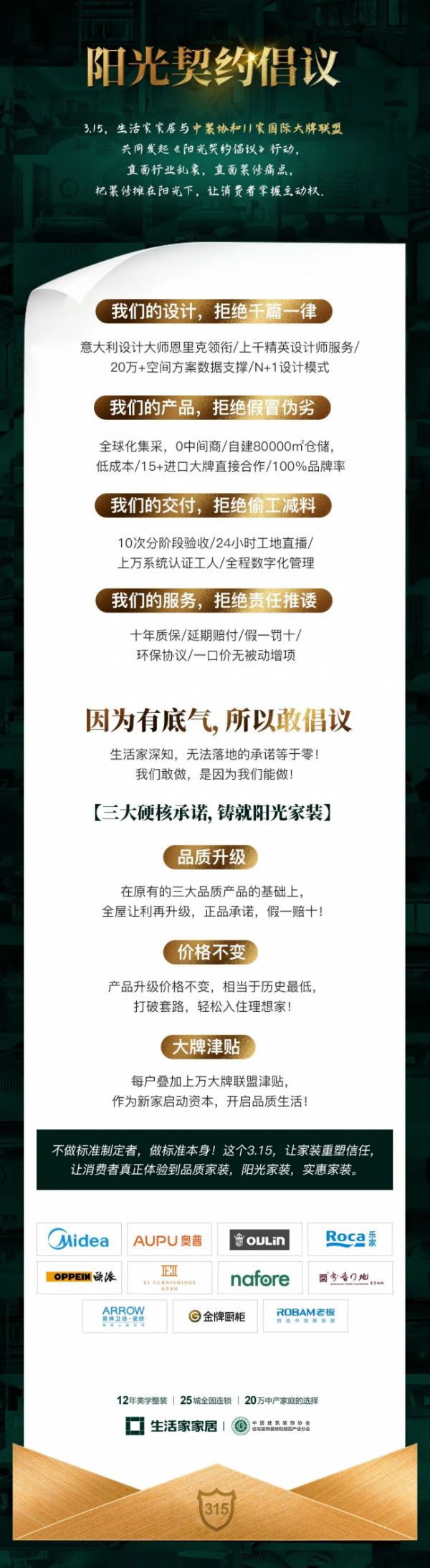 今年315,为保障每一位消费者的权益,生活家家居联合中装协、11家国际大牌联盟共同发起《阳光契约倡议》行动,把装修摊在阳光下,让消费者掌握主动权。
