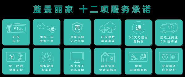 在服务管理方面,蓝景丽家坚持推行“十二项服务承诺”,服务承诺包括含明码实价、30天无理由退换货、质保一年服务三年、延迟送货返6‰违约金等,内容涵盖家居消费售前、售中、售后全环节,形成严密的服务管理体系,为消费者无忧装家保驾护航。其中在质保、送货、退换货等方面的承诺内容,优于国家标准。