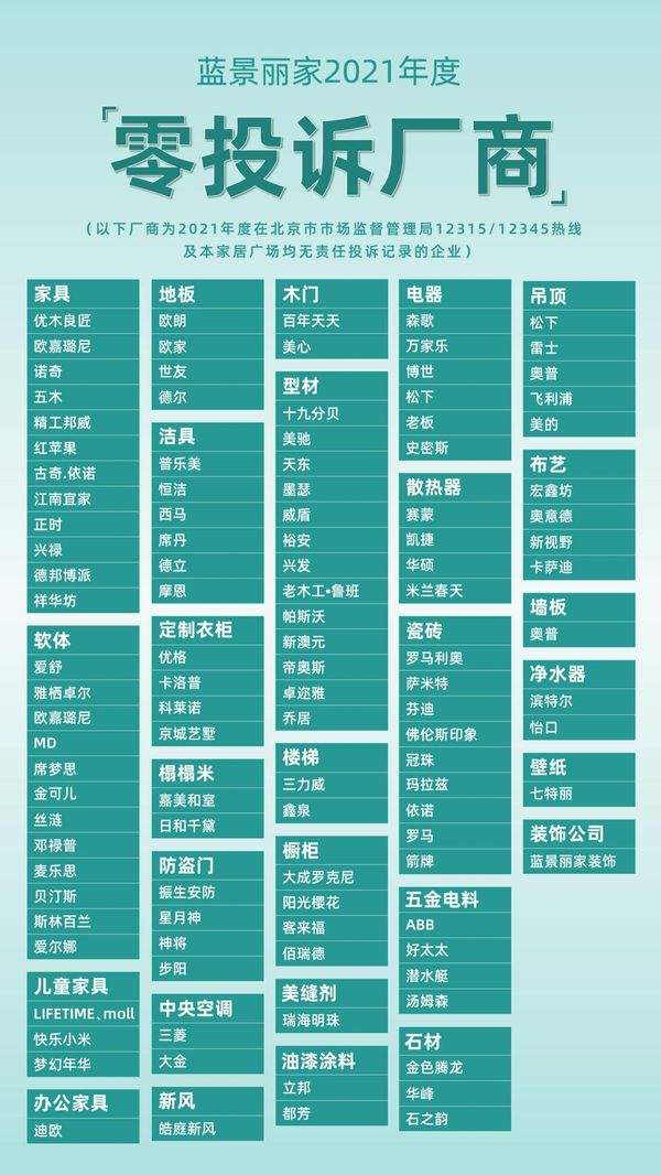 “零投诉厂商”评选规则为上一年度在12315/12345热线及本家居商场均无责任投诉记录的厂商进行数据核实,评选小组评议评审、公司审核批准,确定“年度零投诉厂商”的最终评选结果。2022年3月,“2021年度蓝景丽家零投诉厂商”评选结束,并进行为期一年的公示。