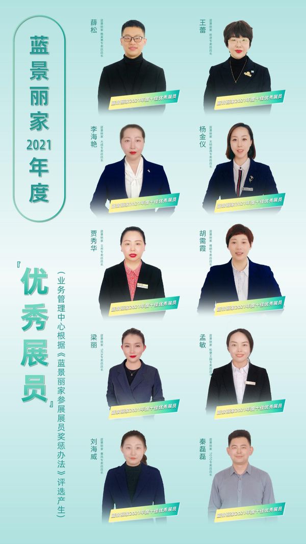 为了给消费者提供更高品质的家居服务,同时发挥先进个人的带动作用,蓝景丽家每年进行一次“优秀展员”评选,通过对驻场展员在诚信服务、专业知识提供、团队建设、销售业绩、顾客满意度等方面进行综合评定。2022年,经层层选拔,共评选出十位优秀展员,进行奖励公示。