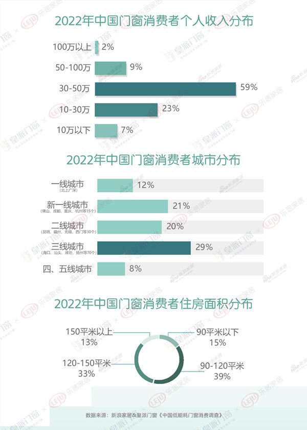 《白皮书》显示,2022年,中国门窗的消费者年龄主要分布在19-39岁,中青年成为门窗消费主力军,且男性占比59%,略高于女性。同时,调研人群平均年收入在30-50万之间,占比59%,主要集中在新一线和二三线城市,门窗新中产消费者崛起。(见图1与图2)