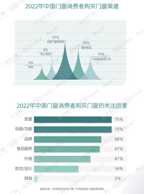 在购买渠道选择上,消费者以专营店为主,数据显示,此次调查中,57%的调查人群选择品牌门窗专营店,选择建材商城的人群占26%。选择产品时,消费者以性能、品牌、质量及售后服务等为主要考量因素,其中质量和性能占比75%,品牌占比68%,售后服务则是67%。(见图3)