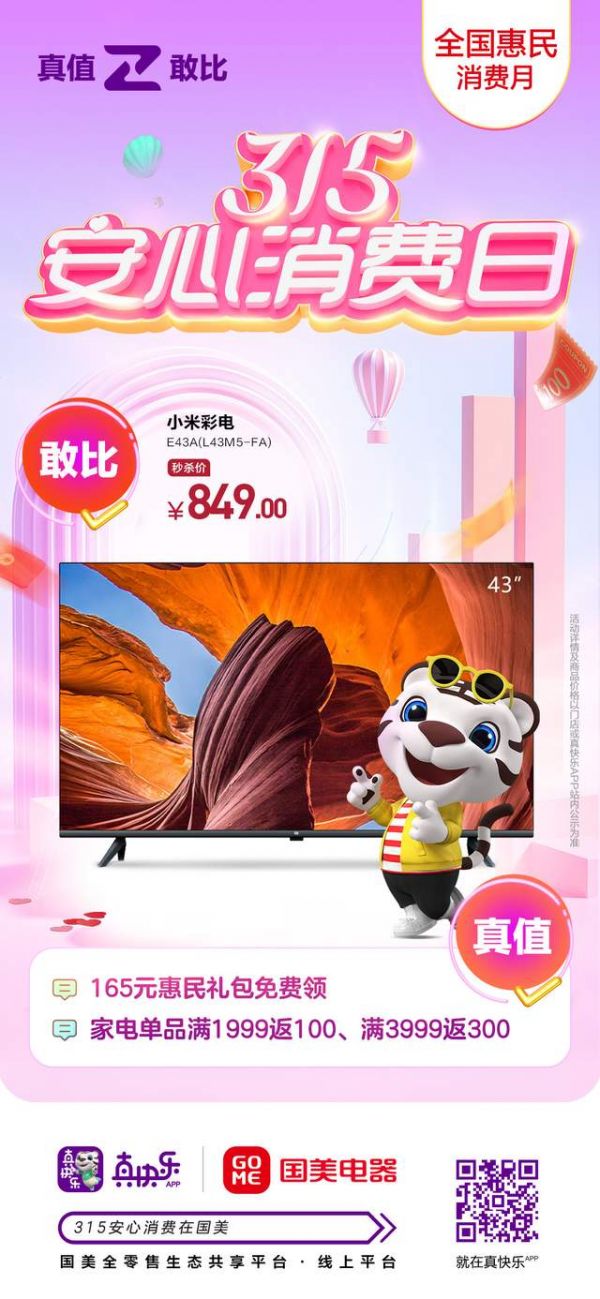 伴随着收入的增加,居民消费出现两个变化:一是高品质消费、个性化消费成为“消费升级”的大趋势;二是人们在消费产品的选择上,不仅有追求高颜值、高效率、大品牌,而且有更多的消费者渴望更安心的消费。基于此,35年来始终与中国家庭同频共进的国美就强势出击,3月4日至3月31日,真快乐APP和国美电器火热开启惠民消费月补贴活动,这场覆盖全国423个城市、4145家线下门店的黑伍大促,通过线上线下链路深度融合,用万千低价爆品且保障品质,服务于广大消费者,全力保障消费者权益,解锁安心消费体验。