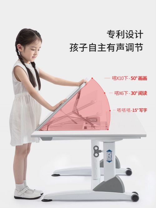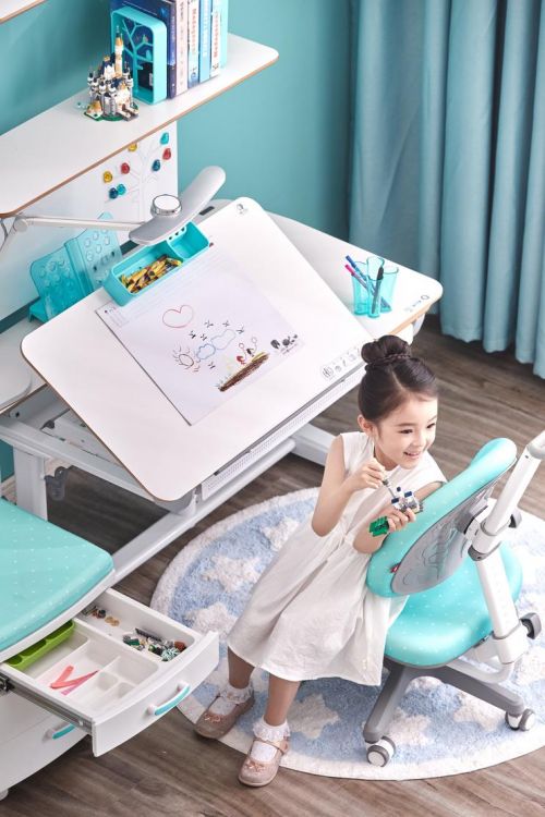 大将作面板可调节角度为0°-45°,共12个档位,同时满足孩子在面对读写绘画等不同情况下的使用需求。一体成型收纳大抽屉、隐藏式阅读书档保证了使用空间足够大,桌面极简设计也可以帮助孩子培养专注力。配套的人体工学椅,可支撑人体背部曲线,保护脊椎,舒缓疲劳,释放腿部压力,养成正确坐姿好习惯。